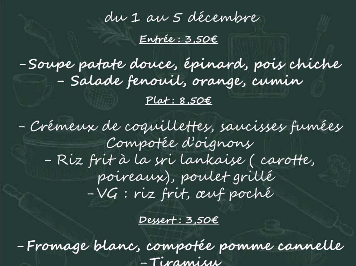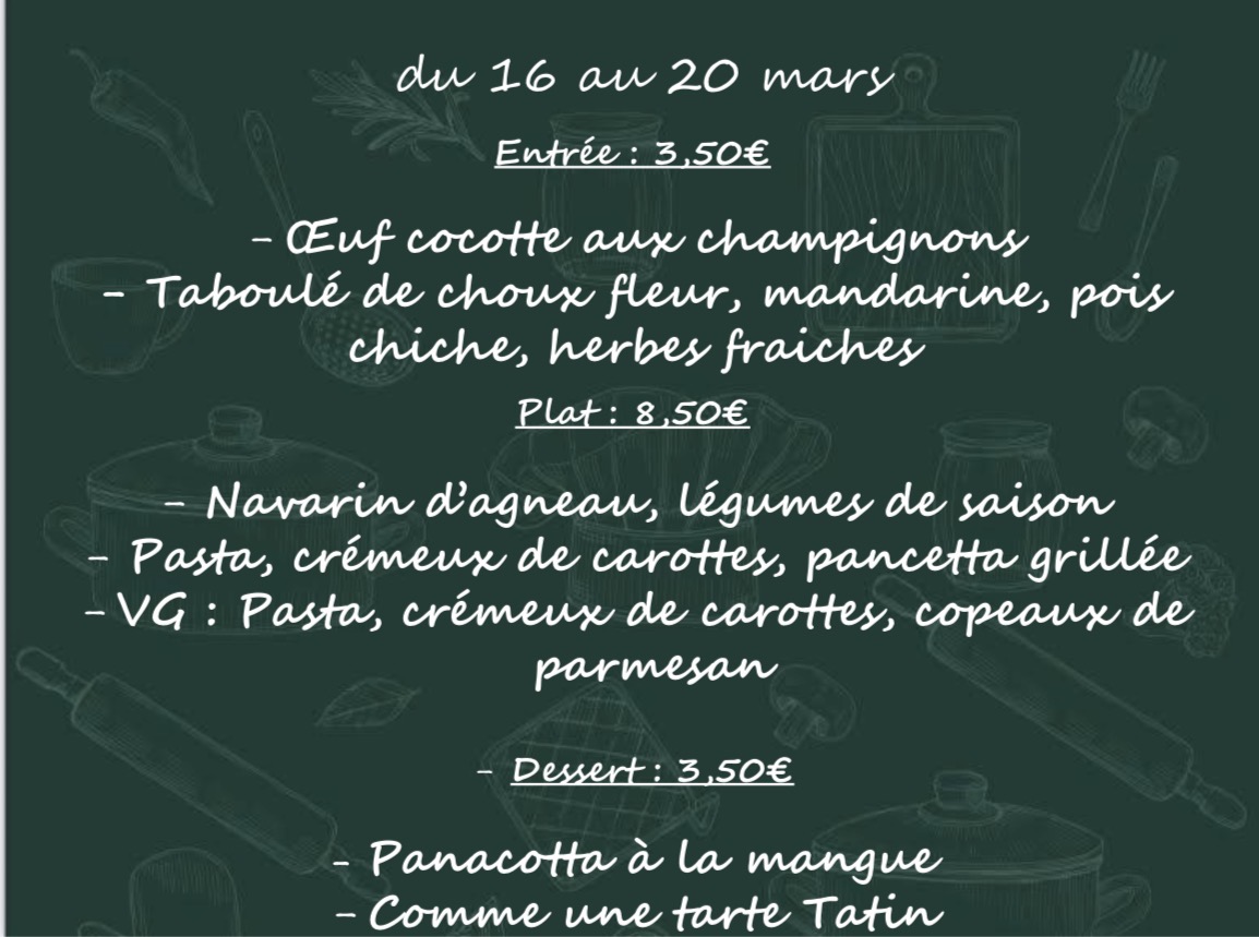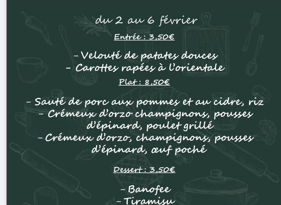 2 entrées au choix à 3,50€ , 3 plats au choix à 8,50€ dont un végétarien et 2 desserts au choix à 3,50€.